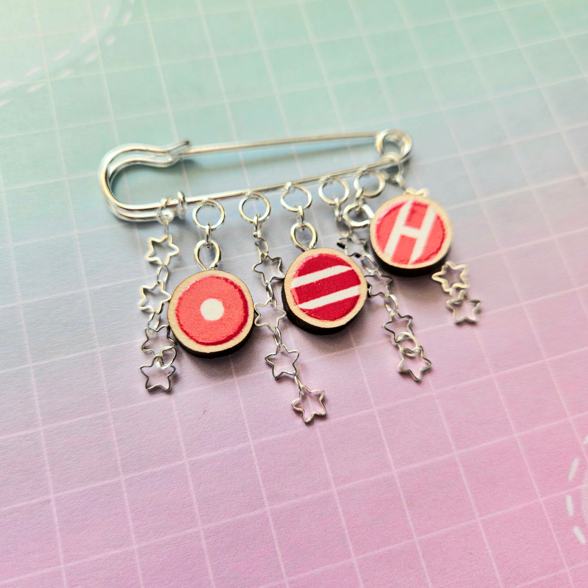 A safety pin style brooch featuring rofessionally, responsibly sourced birch 0.5 inch wood charms and star chain